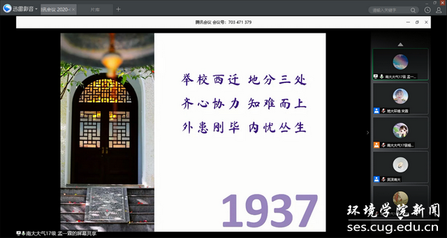 活动第五项,中国地质大学(武汉)为南京大学118周年校庆献礼,生物大气党支部全体成员打开摄像头,向他们表示了最真诚的祝愿:中国地质大学(武汉)环境学院生物大气专业大学生党支部全体祝南京大学118周年校庆生日快乐,繁荣昌盛,再谱华章。生物大气党支部党员王立诚说:值此南京大学成立118周年之际,祝福南京大学生日快乐。大江之东,金城之中,天开教泽,道启南雍。自1902年以来,回望历史,南京大学总是宏大而光辉的,嚼得菜根做的大事为这所大学奠定了百年基调。去年十一月也有幸去南京大学鼓楼校区游玩,绿茵蓝天的衬托下,北大楼的身姿愈发青葱,布满爬山虎的藤蔓有种淡雅祥和的气息,和“中国最温和的大学”之称莫名契合。忠于使命,勇于担当,如日之升,如月之恒,最后,祝愿南京大学再创辉煌!