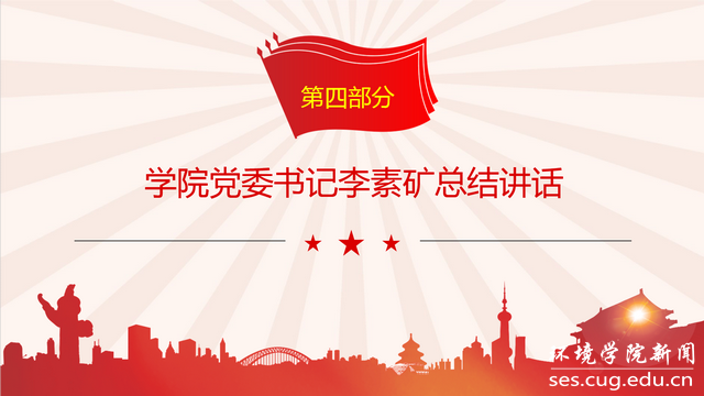 学院党委书记李素矿总结讲话,他说,环境学院党委荣获教育部第二批全国党建标杆院系,离不开全院27个师生党支部的扎实工作基础和强有力的党建工作队伍,离不开每个党支部的战斗堡垒作用、每个党员的先锋模范作用和学院党委政治核心作用的充分发挥和相互联动,代表学院党委向大家表示衷心感谢。他在充分肯定了各个党支部所做的工作方案和创建思路基础上,要求各个党支部创建方案要与学校、学院的方案要求形成“一盘棋”。一要推进“七个有力”,做到教育、管理、监督党员有力,做到打铁还需自身硬;同时要发挥战斗堡垒和先锋模范作用,团结群众,做好非党员师生工作,做到组织、宣传、服务、凝聚师生有力。二要扎实开展习近平生态文明思想“三进”,争做新时代生态环保铁军。把规定动作和自选动作有机结合,在做好做齐党建规定动作基础上,将党建工作和专业学习、自身发展紧密结合,体现跨学科专业教育特色,体现本科、硕士、博士各学段特点,推进水土气生环一体化发展格局,推进美丽中国“4+N”环境地球科学类课程思政,推进张国旗班行动计划,做到支部党建有特色有品牌有亮点。三要进一步提高政治站位,让党旗高高飘扬。党员同志要亮明身份做党建,支部要旗帜鲜明讲政治,在思想上政治上行动上同以习近平同志为核心的党中央保持高度一致,增强“四个意识”坚定“四个自信”,做到“两个维护”,做“四讲四有”的合格党员。四要继承优良传统,创新探索。各位支部书记要加强党性修养,再接再厉,做好每次活动每个环节的传承创新,形成历史积淀。只有这样,每个支部的党建工作才能一步一个脚印扎实推进,不断迈上更新更高台阶,实现学院党建高质量发展。