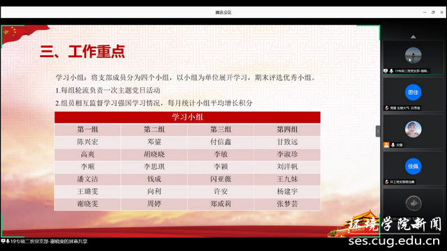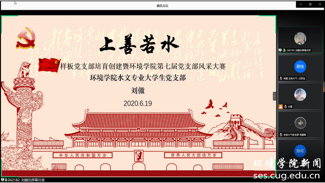 (通讯稿宋霖 编辑耿婧)为深入贯彻党的十九大精神和习近平新时代中国特色社会主义思想,推进样板支部培育创建和高校双百创建工作,6月19日上午,环境学院全体非毕业年级党支部委员及学生党员代表通过腾讯会议室以“党旗飘扬 党建领航”为主题召开学生样板党支部培育创建暨环境学院第七届党支部风采大赛。学院党委书记李素矿、党委组织部副部长冷再心、党委学工部副部长蒋怀柳、学院党委副书记姜明敏、学工处思政办主任徐伟、学工处思政办副主任熊程应邀参加会议,学院党建辅导员宋霖主持会议。
