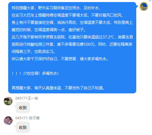 根据湖北省及学校疫情防控规定,为保证参加实习学生的身体健康,学院严格遵守疫情防控要求,细化在站疫情防控纪律,要求全体同学在公共场所戴口罩,每天早午晚三次报体温,在站实行封闭式管理,无特殊情况不得擅自离站。为保障饮食卫生安全,原则上不允许学生点外卖。同时,每天出野外时必须戴安全帽,穿荧光背心,带安全牌,严肃强调学生野外出行安全。在各班级干部得全力协助下,目前每个同学都能自觉遵守疫情防控纪律,疫情防控工作落实到位。