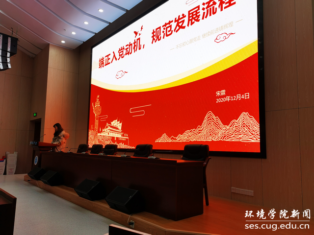 (通讯员丁奎元 编辑耿婧)2020年12月4日,中国地质大学(武汉)第六十九期入党积极分子培训班暨环境学院第二十三期入党积极分子培训班第一讲在科教楼四108正式开讲,环境学院党建辅导员宋霖以“端正入党动机,规范发展流程”为主题展开授课。