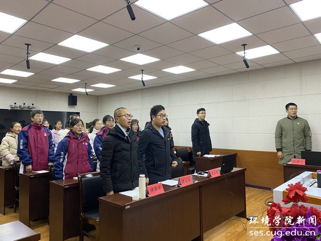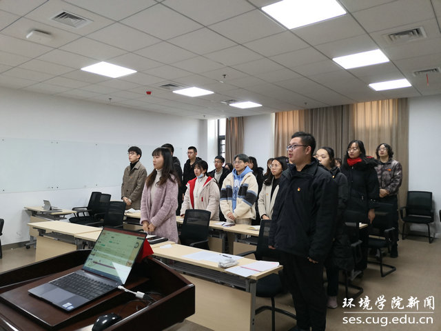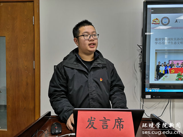 水文专业大学生党支部书记刘傲介绍党支部发展情况。他说,水文支部在环境学院党委的正确领导下,致力打造“双创”品牌,在支部党员思想学习、成长发展、科研能力、实践服务等方面实现引领作用:支部曾邀请华中科技大学先进学生党支部,来院介绍典型经验;与教师党支部共同参观中共五大会址,加强师生党建交流;组织支部成员进行咀里湖志愿清扫活动;成立党员帮扶小组,让优秀同志帮扶成绩薄弱同学;学院搬迁期间,组建义务搬迁工作队,帮助女同学搬运行李。最终,在支部成员的共同努力下,支部今年获评校“十佳党支部”。