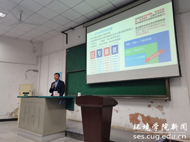 会议最后一项,王海锋副书记从“为什么读大学?为什么来地大?为什么在这里听课?”的问题引入,以“珍惜时光,主动作为,沉淀积累,厚积薄发”为题目,进行学生成长与发展主题教育。一是介绍了“底线”和“发展线”概念,通过以往学生案例,勉励大家守牢底线,向优秀学生看齐。二是号召同学们充分发挥好本科生导师制的作用,利用好环境学院的学科和专业优势,主动融入研究型学院发展大局,成为德智体美劳全面发展的社会主义建设者和接班人。三是结合自身成长经历,引导同学们主动适应大学的学习生活,珍惜时光、主动作为,实现“内驱型成长”。四是通过引用地大校友温家宝2012年回母校的讲话,鼓励大家发扬艰苦朴素、求真务实的校训精神,沉淀积累、厚积薄发,培养艰苦奋斗的素质和独立思考的能力。五是引用《习近平的七年知青岁月》和《温家宝地质笔记》两本书的内容,引导同学们要立大志、明大德、成大才、担大任,努力成为堪当民族复兴重任的时代新人。