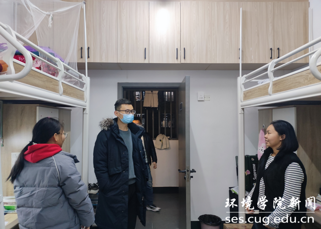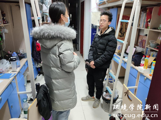 (通讯员陈俊男 摄影耿子涵 编辑耿婧)12月10日-11日,环境学院党委副书记王海锋带领学工组全体专兼职辅导员走访学生宿舍,看望南望山校区和未来城校区学生,他们与学生亲切交谈,了解同学们学习生活情况,期末考试复习备考情况和宿舍卫生状况,了解学生对学校当前防控政策的意见和建议,强调要坚持疫情防控不松懈,严守防控工作要求,不恐慌、不造谣、不传谣,并提醒大家冬季是传染病高发季节,严格落实“戴口罩、勤洗手、常通风、少聚集”等个人防护措施,养成良好的个人卫生习惯,如出现呕吐、发热、腹痛和腹泻等症状,不要隐瞒、及时上报各年级辅导员。