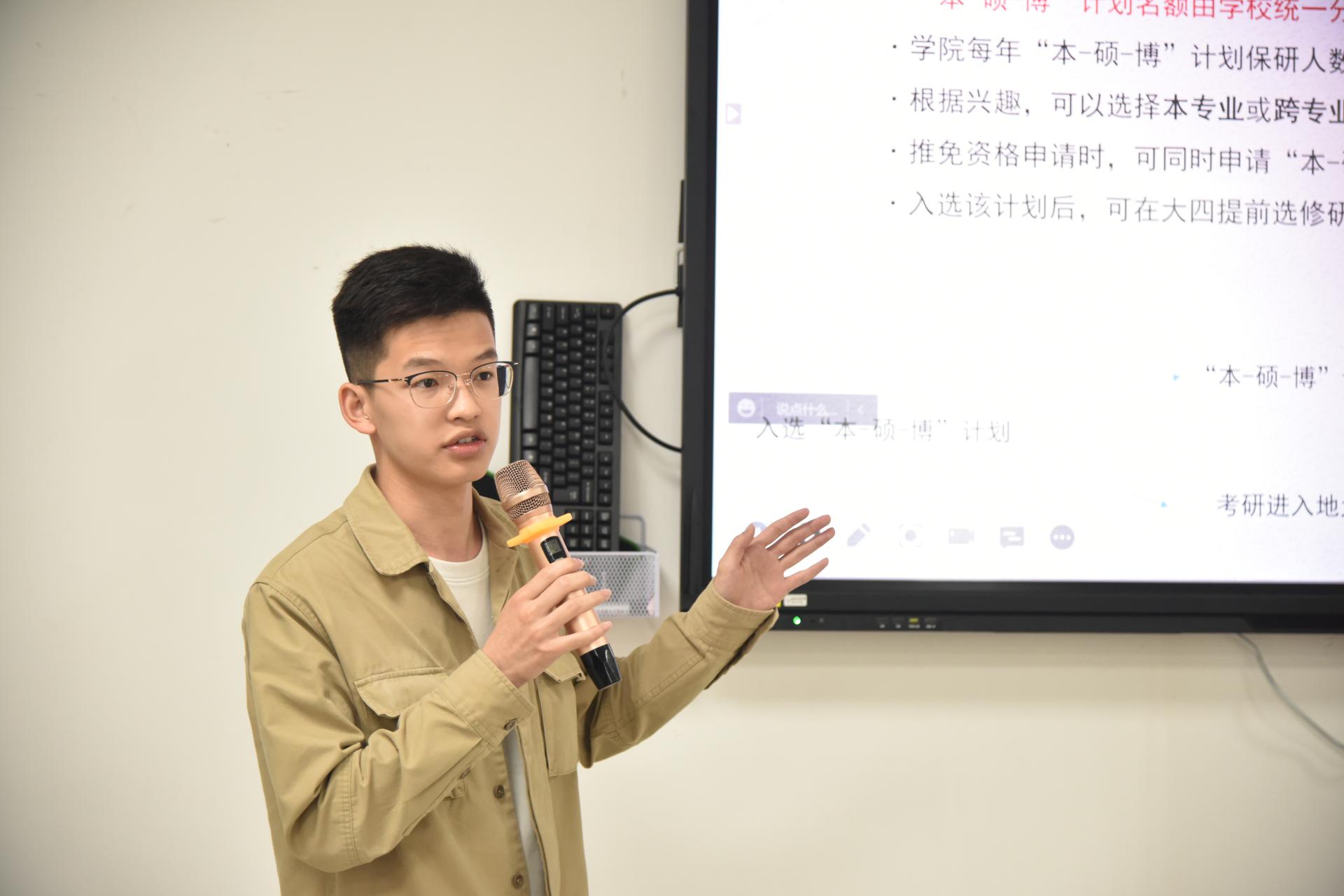 首先,2018级中加项目学生李宜伦以专业绩点排名第一的成绩获得保研推免至武汉大学水利水电学院,他从夏令营、预推免和正式推免三个阶段的流程,院校选择,联系导师,学院推免方案等方面进行了详尽的讲解,鼓励同学们尽早确定方向,找准自己的专业目标,努力提升自身水平和综合素质;贺沁文通过我校“本硕博”贯通培养计划获得保研推免资格,将攻读我院环境科学与工程专业(直博),他就计划介绍、参选条件、录取流程、前期流程等方面对该计划进行介绍,建议同学们慎重抉择,提前做好规划,尽早与导师取得联系,在保研之路上放平心态、张弛有度。