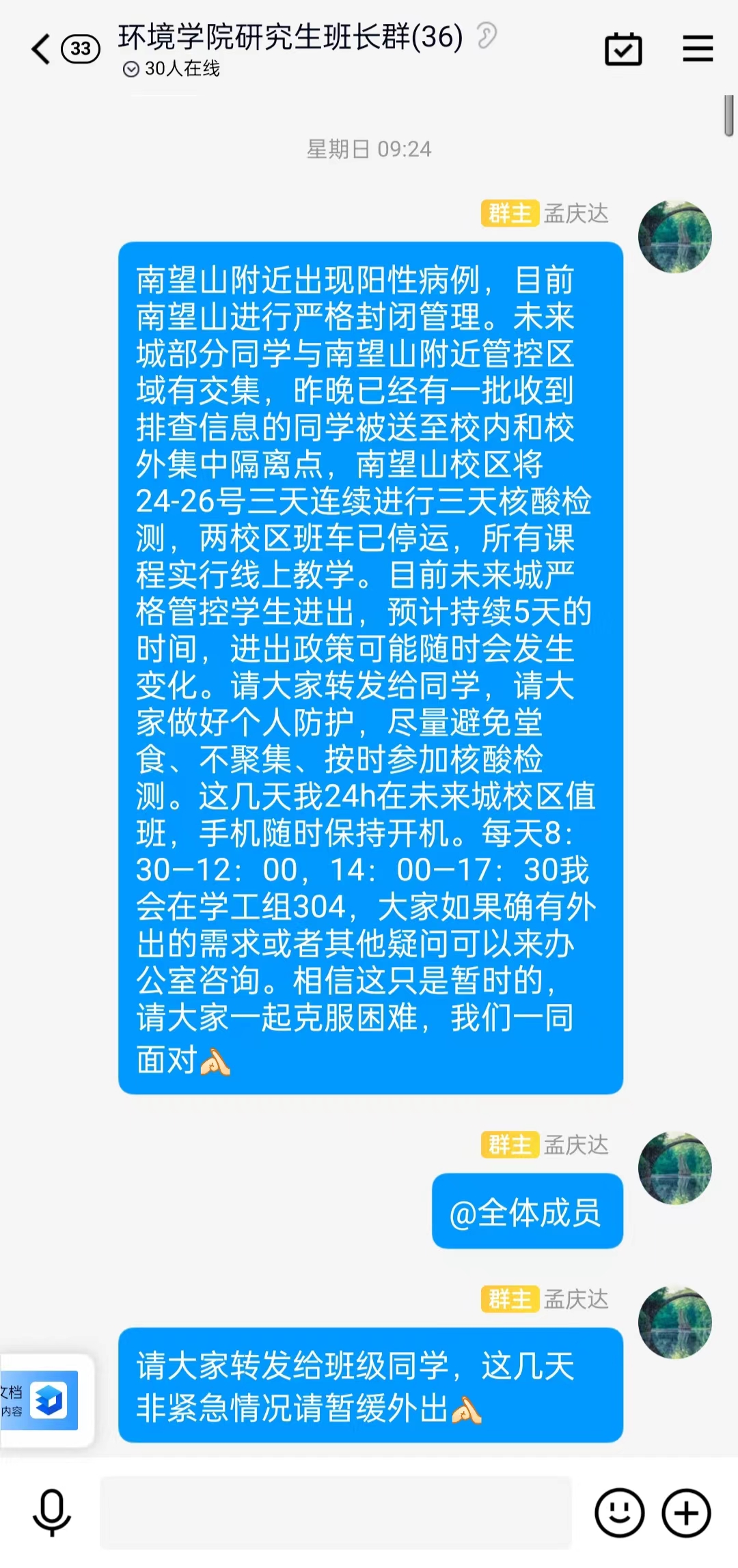 环境学院学工组专职辅导员们以在岗、在线、在位等多种形式,在学生宿舍、微信群、QQ群等岗位上落实疫情防控的各项举措。按照学院党委统一部署,他们迅速织密疫情防控工作网络,第一时间将官方通知和权威信息传递到每一位学生,做到信息全覆盖、全知晓;第一时间摸排学生情况,在校人数、集中健康监测人数、校外隔离人数、未返校人数等,牢牢掌握全体本研学生的信息。“点对点”盯好重点人头核酸检测“一次不差”,“面对面”指挥全员核酸摸排“一个不漏”,“键对键”落实“日报告”“零报告”制度“雷打不动”,他们层层加固疫情防线堡垒,用每一个精准的学生数据构筑起疫情防控的安全网络。充分发挥思想政治优势和密切联系学生优势,用实际行动践行“立德树人”的初心使命,贯彻落实“学生在哪里,思想政治教育就在哪里”的工作信念。第一时间通过网络平台召开疫情防控主题年级大会、党员大会、班团会等,引导学生从身边故事中汲取精神养料,在关注国情中强化制度自信。