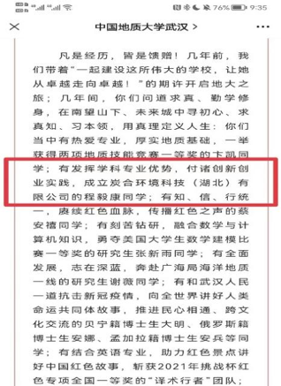 6月22日,湖北省生态环境厅厅长何开文和中国地质大学(武汉)校长王焰新院士参加了学校组织的大气环境监测开放日活动,“炭合”团队在此次活动中向他们简单介绍了团队基本情况,并得到了他们的肯定和鼓励。长江网、湖北广播电视台联合抖音官方、中国地质大学(武汉)官网、环境学院官网、环境学院官微等媒体平台对团队事迹进行了深入的宣传报道,讲述环境人的故事,彰显环境人的时代风采。在学校2022届毕业生的毕业典礼上,中国地质大学(武汉)校长王焰新院士进行了题为“荣光与挫折”的讲话,团队负责人程毅康在王焰新校长的发言中被提名,“炭合”团队还被王焰新校长寄语“炭合团队,大有可为”。