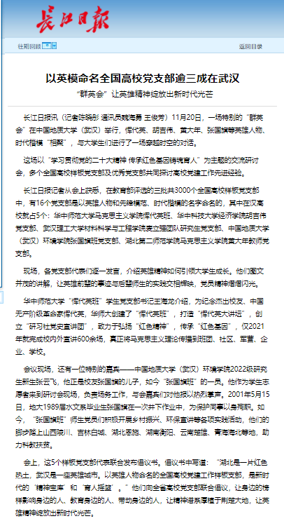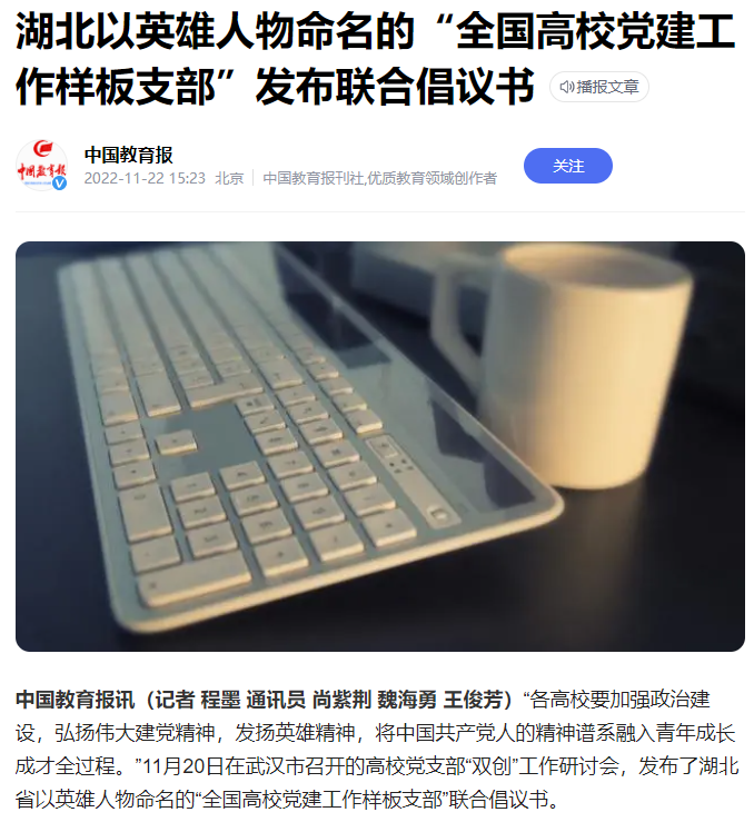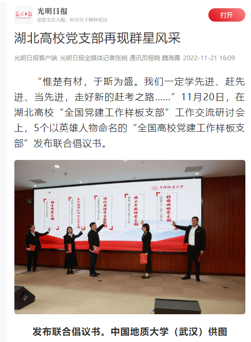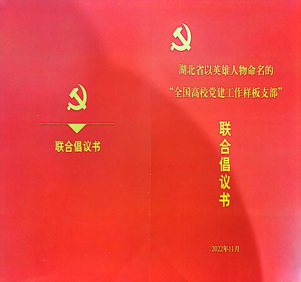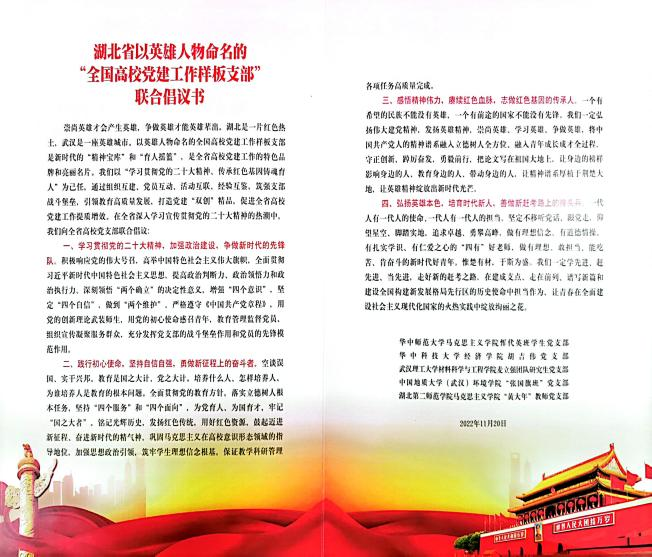 华中师范大学马克思主义学院恽代英班学生党支部、华中科技大学经济学院胡吉伟党支部、武汉理工大学材料科学与工程学院麦立强团队研究生党支部、中国地质大学(武汉)张国旗班党支部、湖北第二师范学院马克思主义学院黄大年教师党支部作为湖北省以英雄人物命名的“全国高校党建工作样板支部”联合发出倡议:学习贯彻党的二十大,加强政治建设,争做新时代的先锋队;践行初心使命,坚持自信自强,勇做新征程上的奋斗者;感悟精神伟力,赓续红色血脉,志做红色基因的传承人;弘扬英雄本色,培育时代新人,善做新赶考路上的排头兵。各支部表示将以“学习贯彻党的二十大精神、传承红色基因铸魂育人”为己任,通过组织互建、党员互动、活动互联、经验互鉴,筑强支部战斗堡垒,引领教育高质量发展,打造党建“双创”精品,促进全省高校党建工作提质增效。