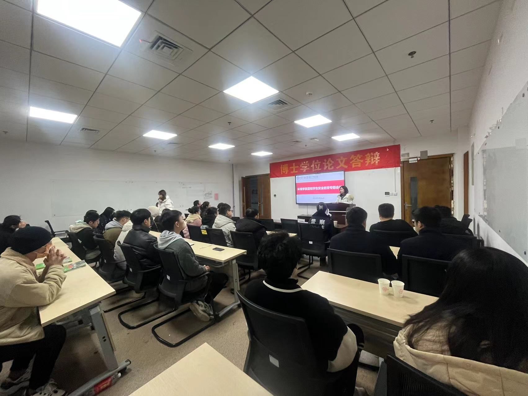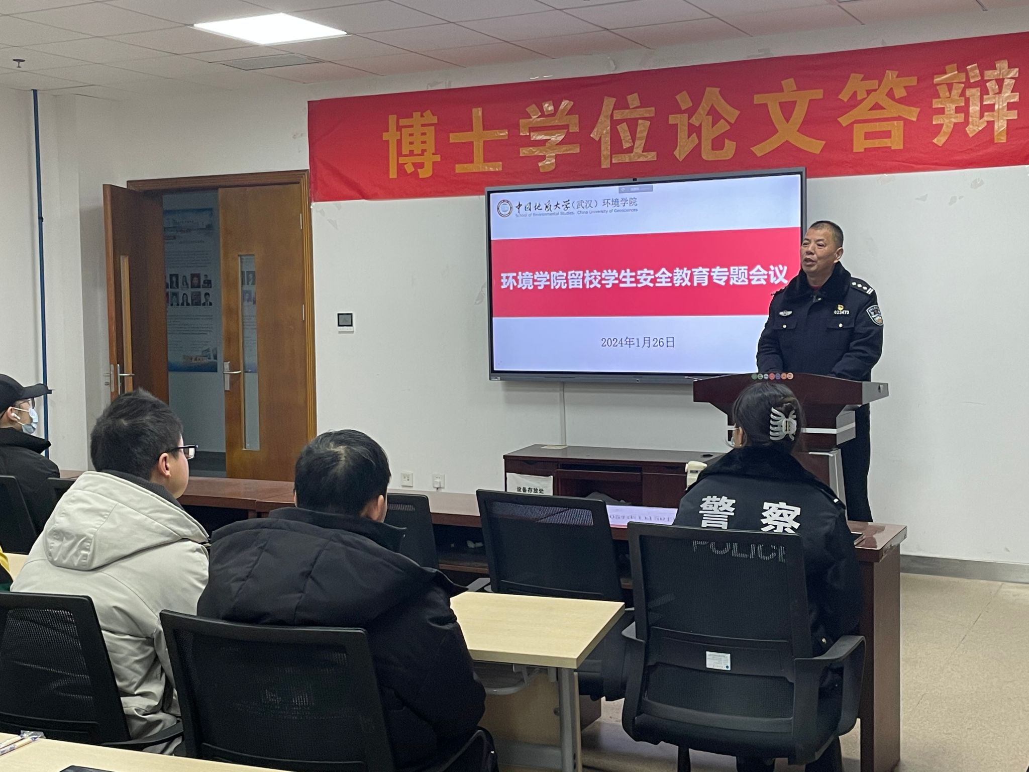 (通讯员陈俊男 摄影徐皓杰、周余 编辑耿婧)根据学校工作部署和学院工作具体安排,为进一步加强学院寒假留校学生安全教育管理工作,增强留校学生安全防范意识和能力,切实保障大家生命财产安全。1月26日上午,学院留校学生安全教育专题会议在环境楼322召开。未来城校区保卫综合办公室主任张献文,东湖高新分局左岭派出所韩红卫警官、董佩珏警官,学院辅导员耿婧,本研课题组、宿舍以及实验室学生代表参会。耿婧主持会议。