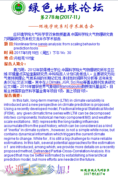 袁乃明,2012年获得博士学位,中国科学院大气物理研究所东亚区域-环境重点实验室副研究员。主要研究方向:气候预测理论,气候系统的长期记忆性,非线性时间序列分析等.近年来发表SCI论文近30篇。其中在J.Climate, JGR, Sci.Rep等著名期刊发表研究论文8篇。2016年曾获世界气象组织Mariolopoulos教授信托基金奖。目前主持国家自然科学基金青年项目1项,面上项目1项。