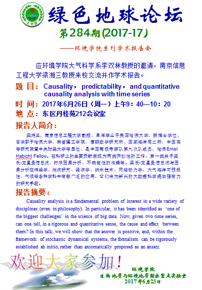 绿色地球论坛第284期(2017-17) ——环境学院系列学术报告会 题目: Causality, predictability, and quantitative causality analysis with time series 时间:2017年6月26日(周一)上午9:40—10:20 地点:东区丹桂苑212会议室