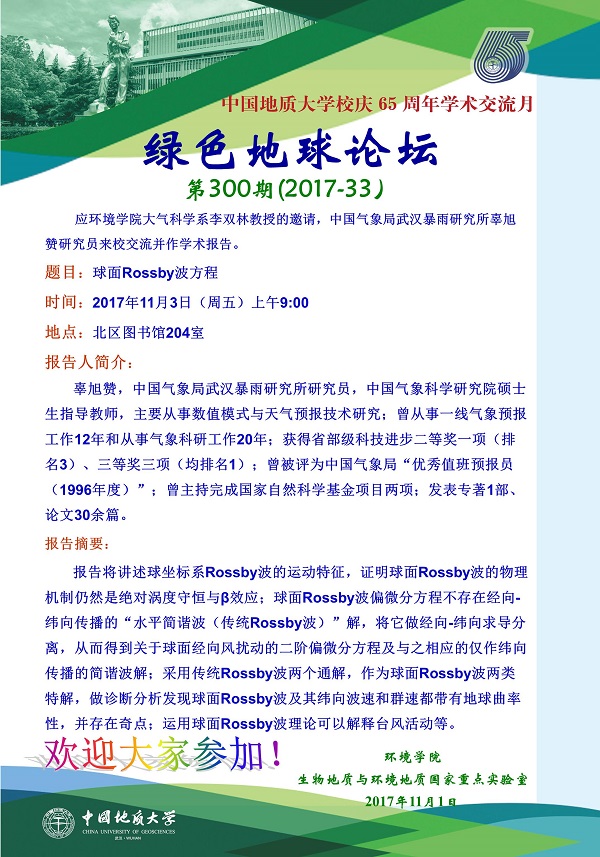 绿色地球论坛第300期(2017-33) ——嗨皮漫画 系列学术报告会 题目:球面Rossby波方程 时间:2017年11月3日(周三)上午9:00 地点:北区图书馆204室