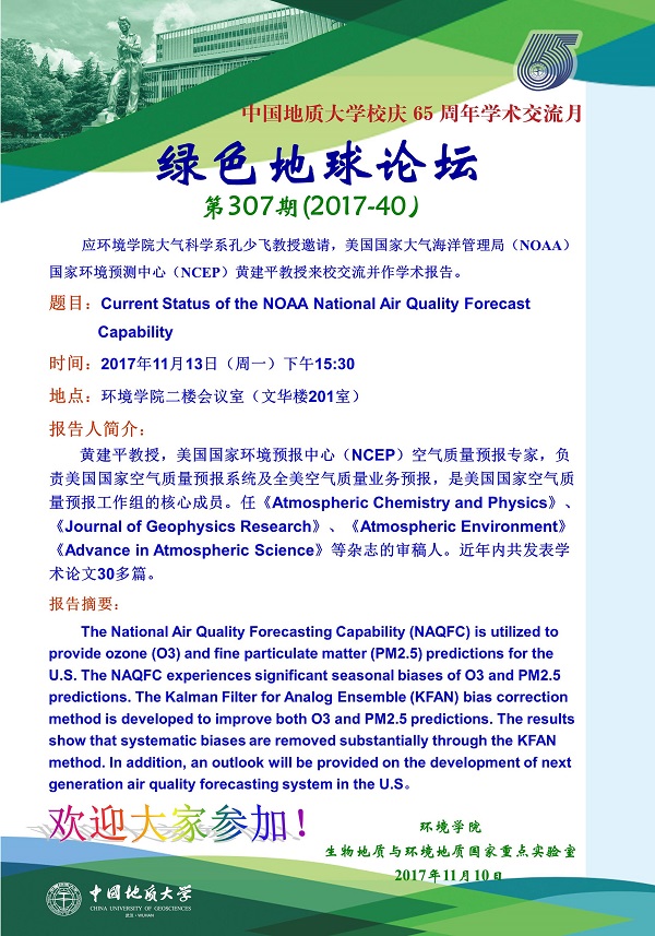 绿色地球论坛第307期(2017-40) ——嗨皮漫画 系列学术报告会 题目:Current Status of the NOAA National Air Quality Forecast Capability 时间:2017年11月13日(周一)下午15:30 地点:嗨皮漫画 二楼会议室(文华楼201室)