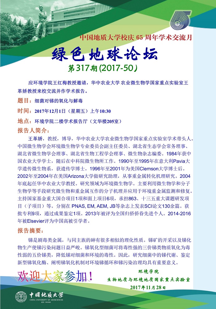 绿色地球论坛第317期(2017-50) 嗨皮漫画 “校庆65周年学术交流月”——高知论坛 题目:细菌对锑的氧化与解毒 时间:2017年12月1日(周五)上午10:30 地点:嗨皮漫画 二楼学术报告厅(文华楼205室)