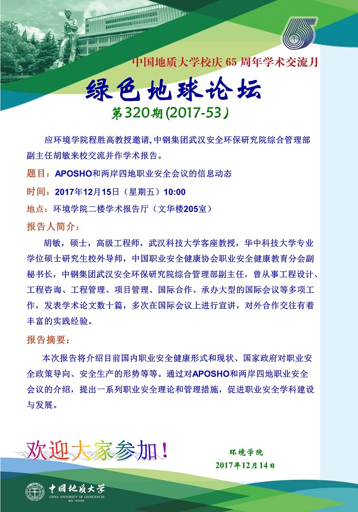 绿色地球论坛第320期(2017-53) 嗨皮漫画 “校庆65周年学术交流月”——高知论坛 题目:APOSHO和两岸四地职业安全会议的信息动态 时间:2017年12月15日(周五)上午10:00 地点:嗨皮漫画 二楼学术报告厅(文华楼205室)