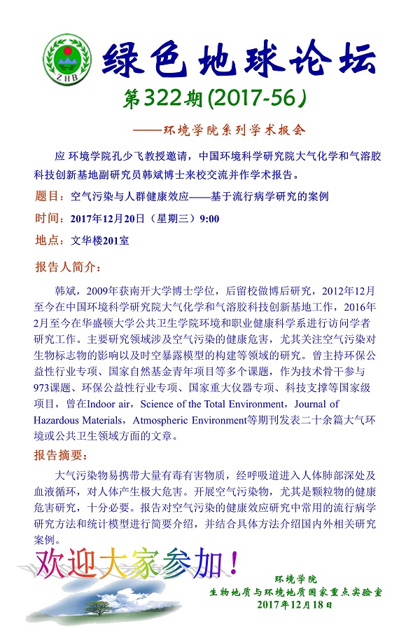 绿色地球论坛第322期(2017-56)——嗨皮漫画 系列学术报告会 题目:空气污染与人群健康效应——基于流行病学研究的案例 时间:2017年12月20日(星期三) 上午9:00 地点:文华楼201室