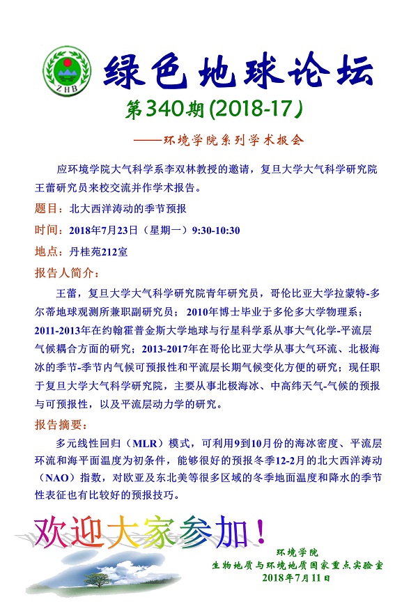 绿色地球论坛第340期(2018-17) ——嗨皮漫画 系列学术报告会 题目:北大西洋涛动的季节预报 时间:2018年7月23日(星期一)9:30-10:30 地点:丹桂苑212室