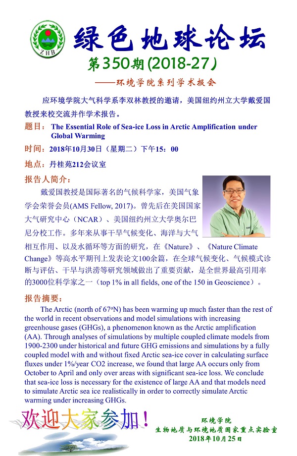 绿色地球论坛第350期(2018-27) ——环境学院系列学术报告会 题目:The Essential Role of Sea-ice Loss in Arctic Amplification under Global Warming 时间:2018年10月30日(周二)下午15:00 地点:丹桂苑212室