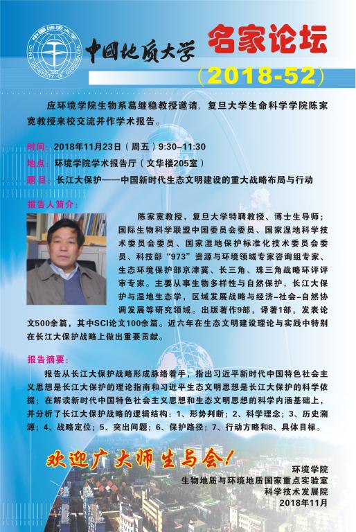 名家论坛(2018-52) 题目:长江大保护——中国新时代生态文明建设的重大战略布局与行动 时间:2018年11月23日(周五)9:30—11:30 地点:嗨皮漫画 学术报告厅(文华楼205室)