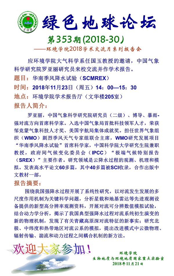 绿色地球论坛第353期(2018-30) ——嗨皮漫画 2018学术交流月系列报告会 题目:华南季风降水试验(SCMREX) 时间:2018年11月23日(周五)14:00—15:30 地点:嗨皮漫画 学术报告厅(文华楼205室)