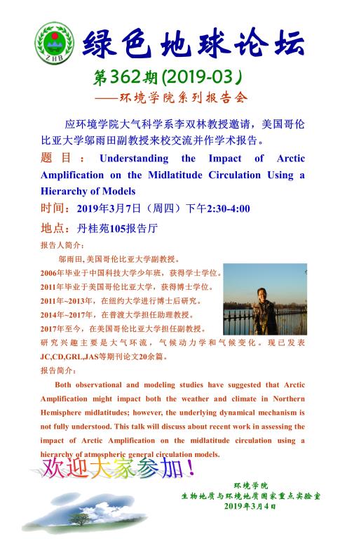 绿色地球论坛第362期(2019-03) ——嗨皮漫画 系列学术报告会 题目:Understanding the Impact of Arctic Amplification on the Midlatitude Circulation Using a Hierarchy of Models 时间:2019年3月7日(周四)下午2:30-4:00 地点:丹桂苑105报告厅