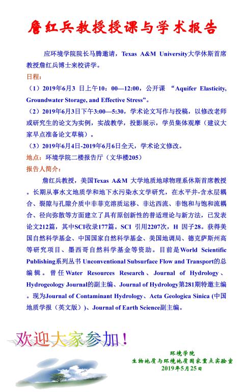 Texas A&M University大学詹红兵教授短期授课和讲学