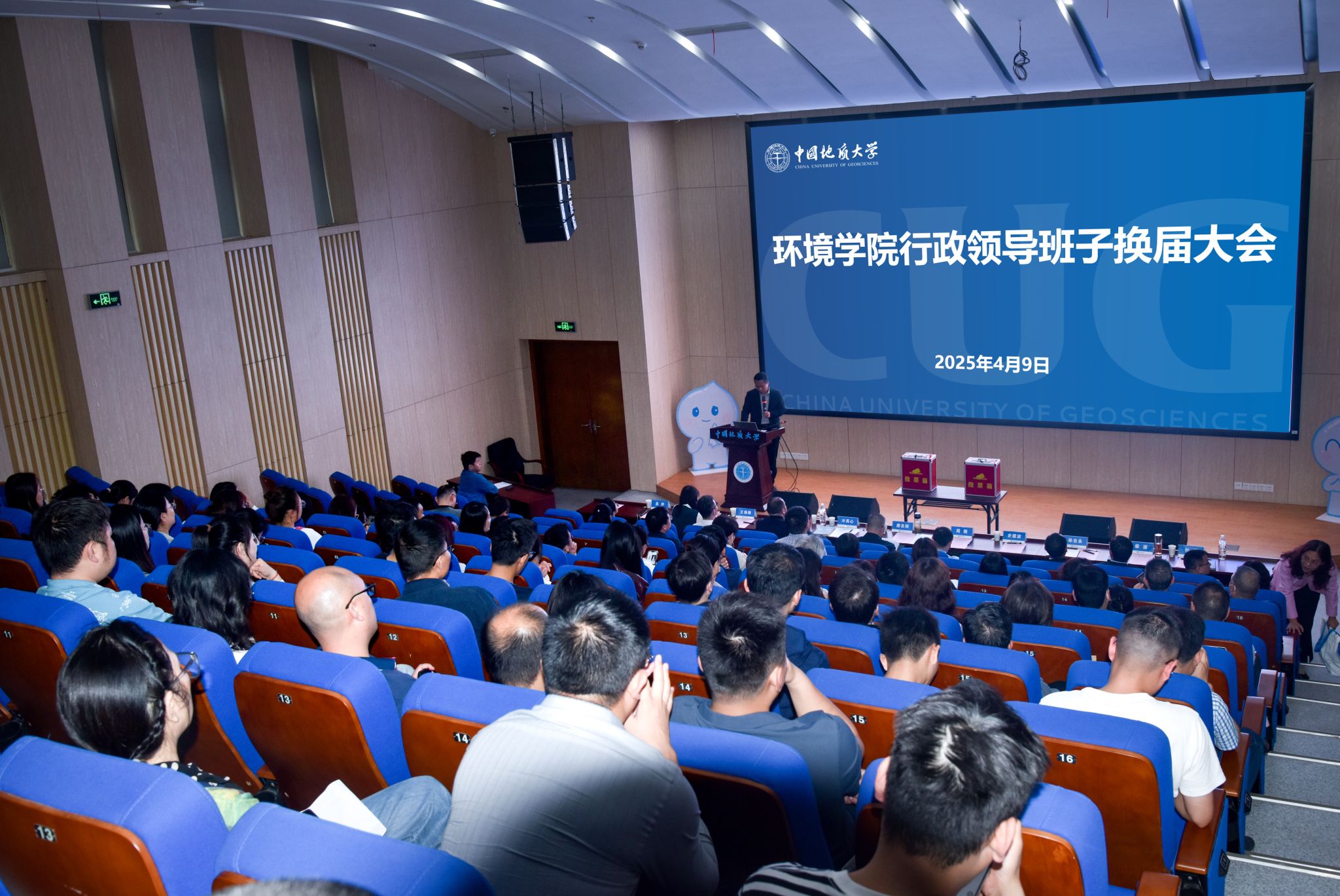 通讯员刘凤莲 摄影张学海 编辑王孟雪)2025年4月9日,环境学院行政领导班子换届大会在未来城校区科教楼四108报告厅举行。校党委副书记、纪委书记唐忠阳,正处级专职组织员周刚,党委组织部副部长冷再心,党委组织部干部科郭倩、吴妍,学院党政领导班子和全体教职工参加大会。学院党委书记姜明敏主持会议。