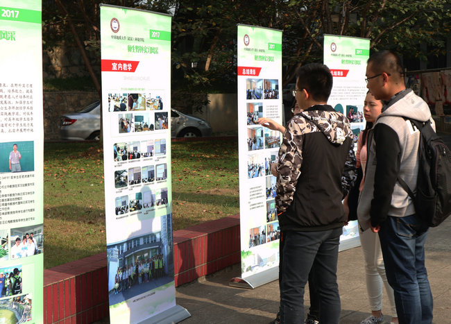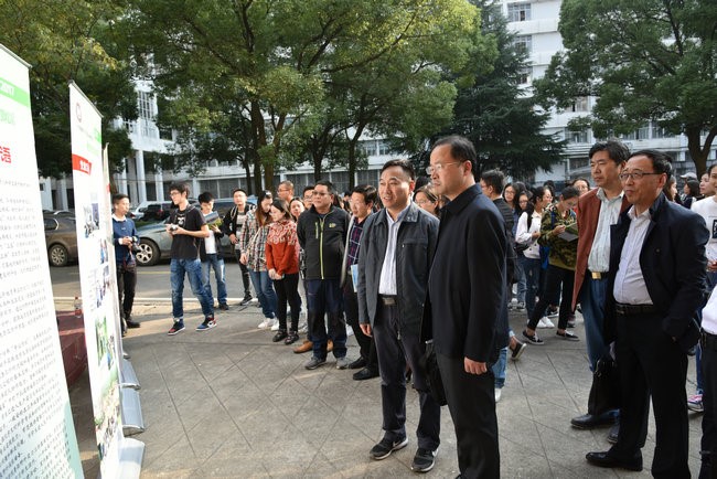 (张学海 /文/图)10月27日下午在文华楼前,环境学院2017年师生野外实习风采展开幕。校党委书记何光彩参观师生野外实习风采展。