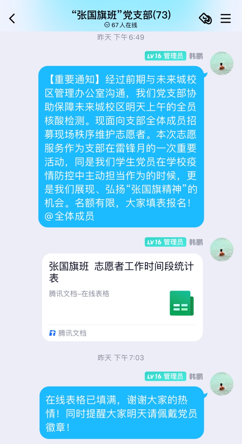 (通讯员王倩、陈鹏飞、韩鹏 摄影边舟悦、覃晓琳、部分图校网 编辑耿婧)党旗举在前,支部冲在前。环境学院“张国旗班”党、团支部获悉3月4日学校进行全员核酸检测这一消息后,第一时间主动请缨,在党委研工部和学院党委的大力支持下、院团委的具体指导下,以志愿服务的形式协助未来城校区管理办公室做好未来城校区全员核酸检测工作。恰逢雷锋精神学习月,“张国旗班”志愿团以“党团联动,致敬雷锋同志”的名义发布志愿者募集通知后,短短片刻,申请人数就远超预定招募人数。