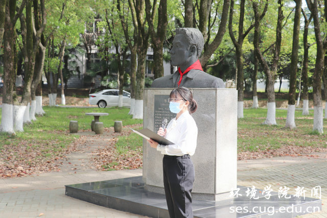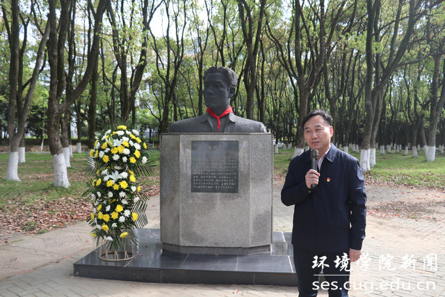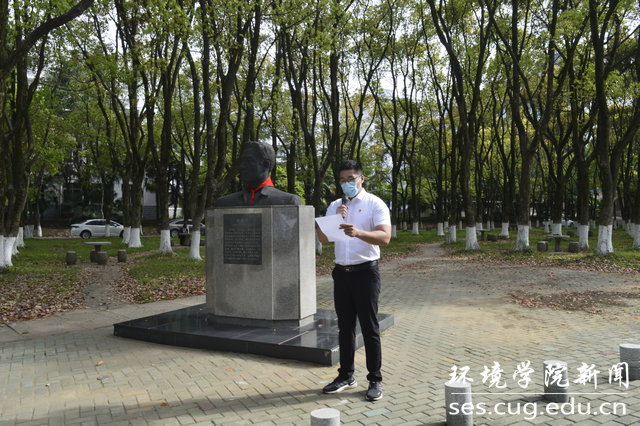 李素矿讲话。他指出,天地英雄气,千古尚凛然。张国旗塑像是校园里闪亮的地标。以英雄校友张国旗命名的党团支部和班团组织已经成为环境学院乃至全校全国的精神品牌,是学院推进党建“双创”和“三全育人”工作的重要支撑。环境学子每年清明来此缅怀英雄校友,是同学们学习生活中的重要内容,也是向革命、建设、开放各个时期的英雄先烈致敬的重要方式。他强调,作为新时代青年学子,要通过缅怀英雄事迹和精神,学习英雄好榜样,强化不忘初心、牢记使命的意志,激励自己永葆赤子情怀、争优时代先锋。他要求,全院各党团组织、各班级、各位同学都要以传承红色基因、培育时代新人为己任,践行红专能优理念,创新开展党团活动,以德居之、以能居之,积极投身美丽中国建设,把论文写在祖国大地上,做政治强、本领高、作风硬、敢担当,特别能吃苦、特别能战斗、特别能奉献的新时代生态环保铁军。