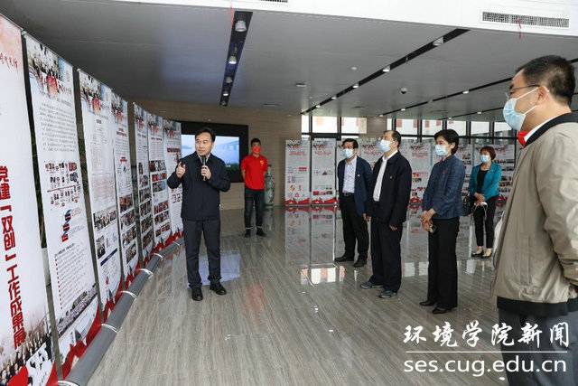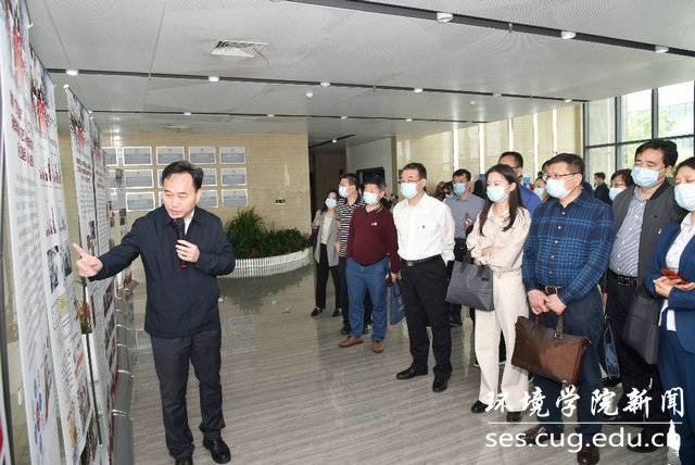 张幸平一行在校党委书记黄晓玫陪同下参观环境学院党建双创工作成果展。院党委书记李素矿汇报环境学院基本情况、党建“双创”工作做法、创新举措和标志成果。